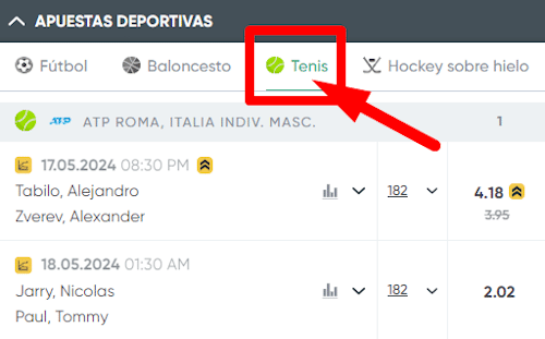 Escoger la modalidad de apuesta y un partido: en el tenis puedes hacer apuestas previas o en vivo. Cuando selecciones la modalidad de tu apuesta, busca entre los partidos disponibles, fíjate en los jugadores que participarán en él y elige uno para apostar.